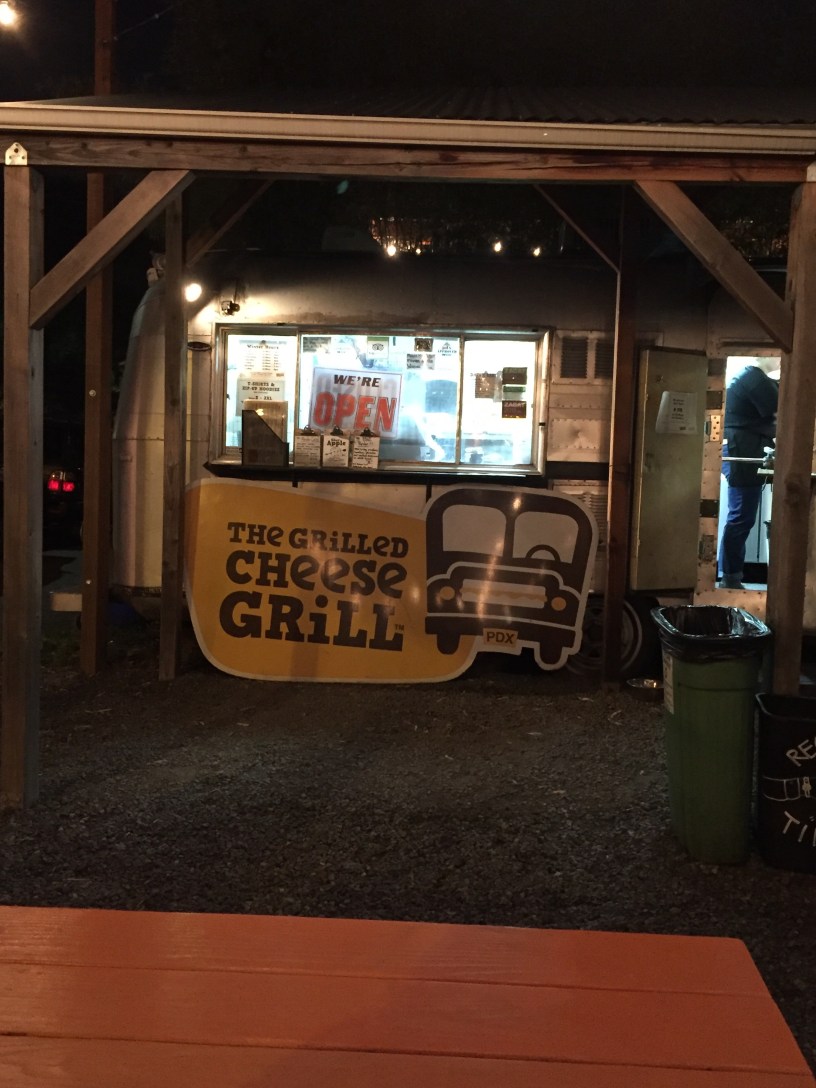There were tons of food trucks along Alberta St., and I think I could spend a week here just trying them all. I decided on The Grilled Cheese Grill because cheese is easily one of my top 5 favorite foods and also, YOLO. I did challenge myself to get something I normally wouldn’t eat slash wouldn’t make for myself – I got a sandwich with Brie, roasted red peppers, spicy mustard, and tomato. The flavors complemented each other well but, being a recovering picky eater, I just wasn’t as fond of the mustard. However, the atmosphere is what would make me go back and try different sandwiches until I found that winner; after getting your food, you can choose to sit at one of the picnic tables by the street, complete with some lovely string lights and music, OR you can sit on the bus-turned-diner. Obviously I chose the bus.