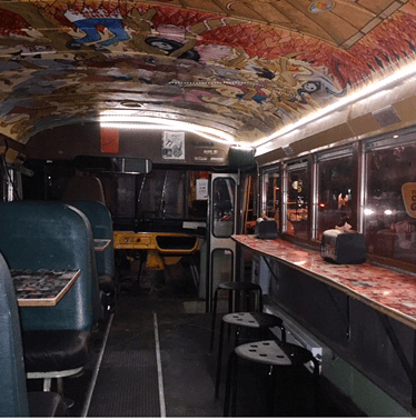 So my sandwich and I sat in a bus seat, alternating between staring at the paintings on the ceiling and the hilariously embarrassing old school pictures collaged on the tabletops.