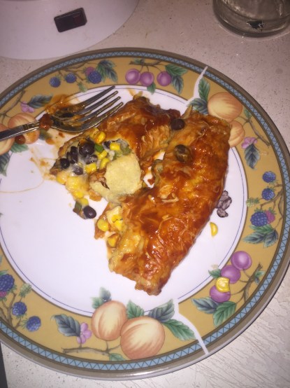 Having been in the midst of my birthday and subsequent adventures, I haven’t made time to go to the store this week. So I used what I had to make some black bean and veggie enchiladas!